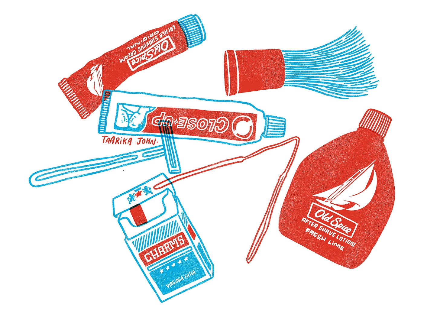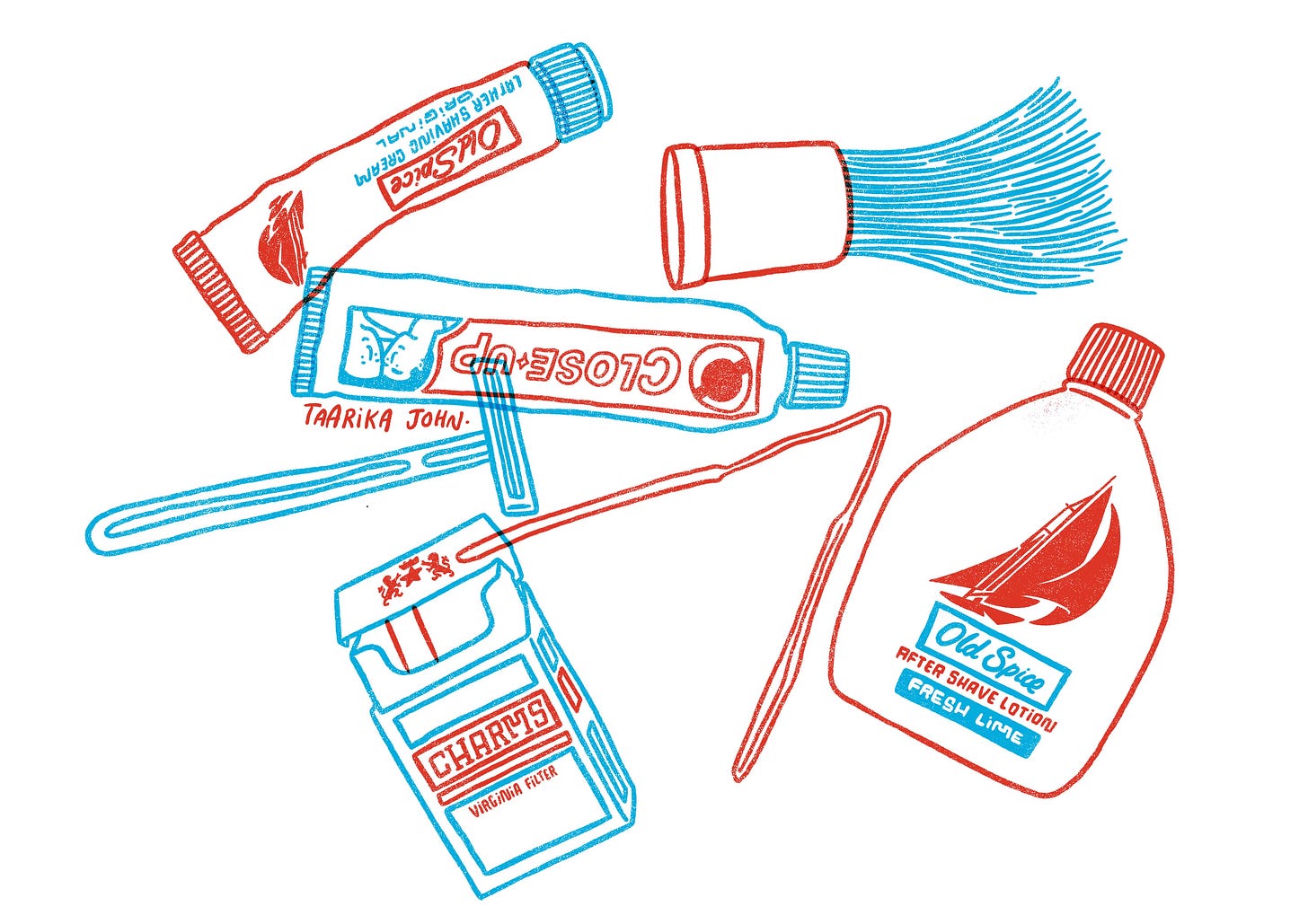I pull out an ancient tube of Close Up toothpaste, squeezed practically empty, its white edges tinged with yellow. Next, I find a rusty pair of tweezers bent out of shape, followed by another half-empty tube of shaving cream. Old Spice aftershave. A razor.